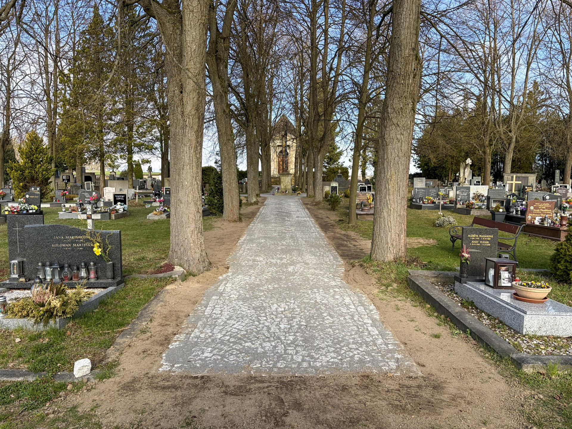 Dokončili jsme výstavbu jedné z cest, která je nyní nově řešena dlážděným povrchem. Původní travnatý úsek byl nahrazen pevnou a odolnou dlažbou. Tato změna přispívá k důstojnějšímu vzhledu tohoto pietního místa a zároveň zajišťuje lepší přístup i za nepříznivého počasí.